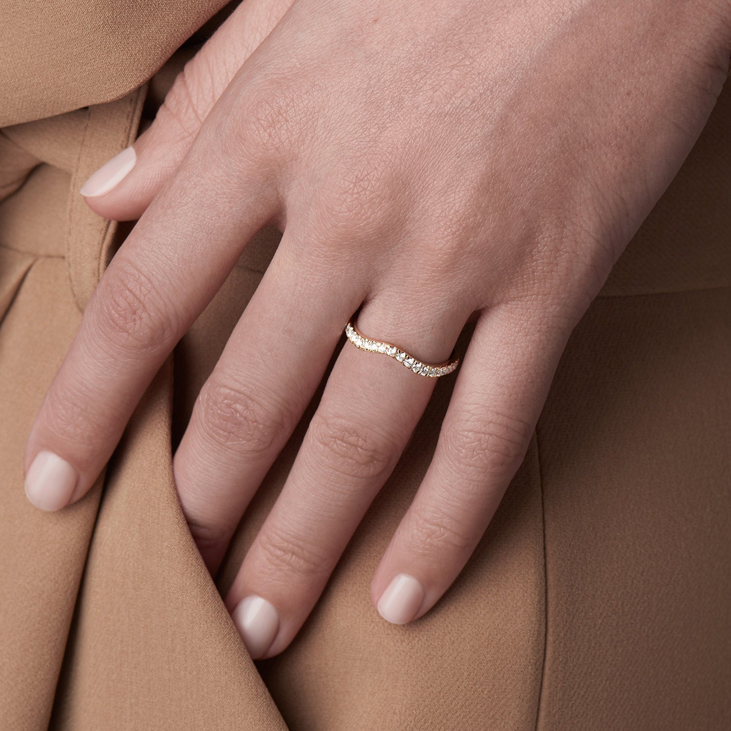 The Rippling Round Ring stands as a celebration of promises made. Captivatingly reimagining tradition, this ring showcases 19 delicate diamonds nestled in a micro pave setting. Its weightless design adds to its comfort and modern appeal. Versatile and meaningful, this chic ring makes for a staple stackable accessory.