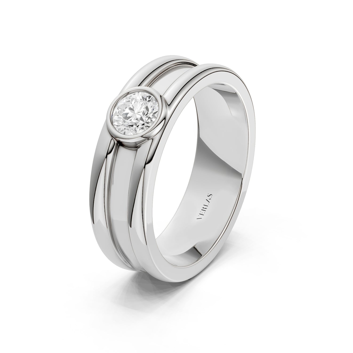 A symbol of love, this Round Encompassing Groove Band showcases a brilliant round-cut diamond, securely cradled in a sleek and modern bezel setting. The captivating groove that gracefully encircles the band sets this men's diamond wedding ring apart. It is the perfect choice for those seeking a sophisticated and understated symbol of their devotion.