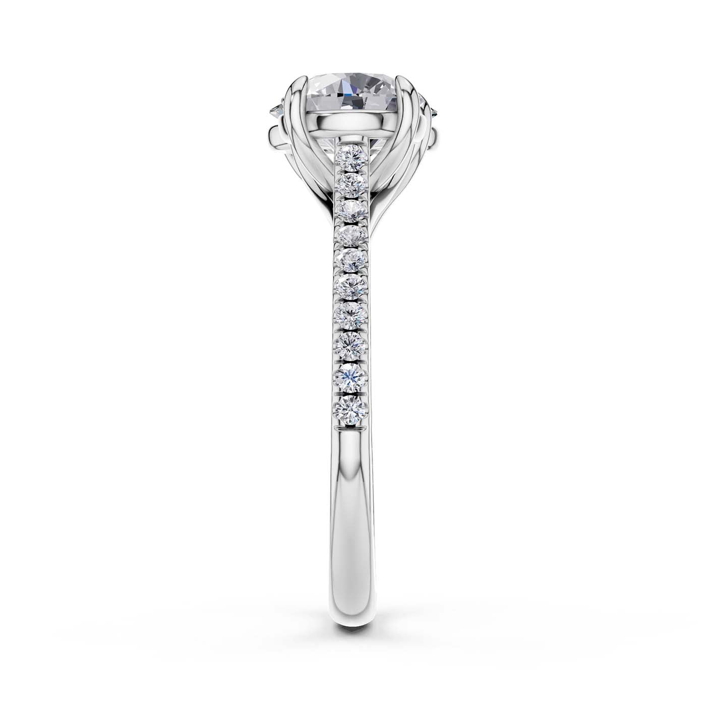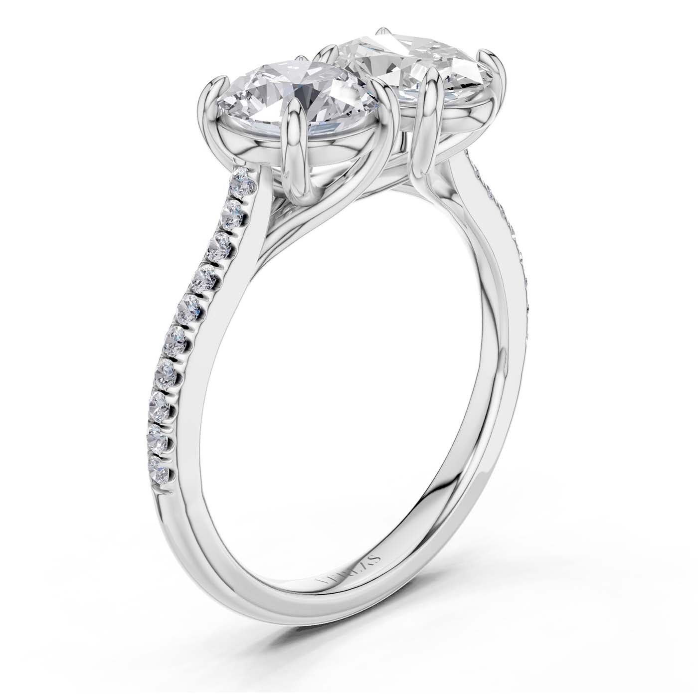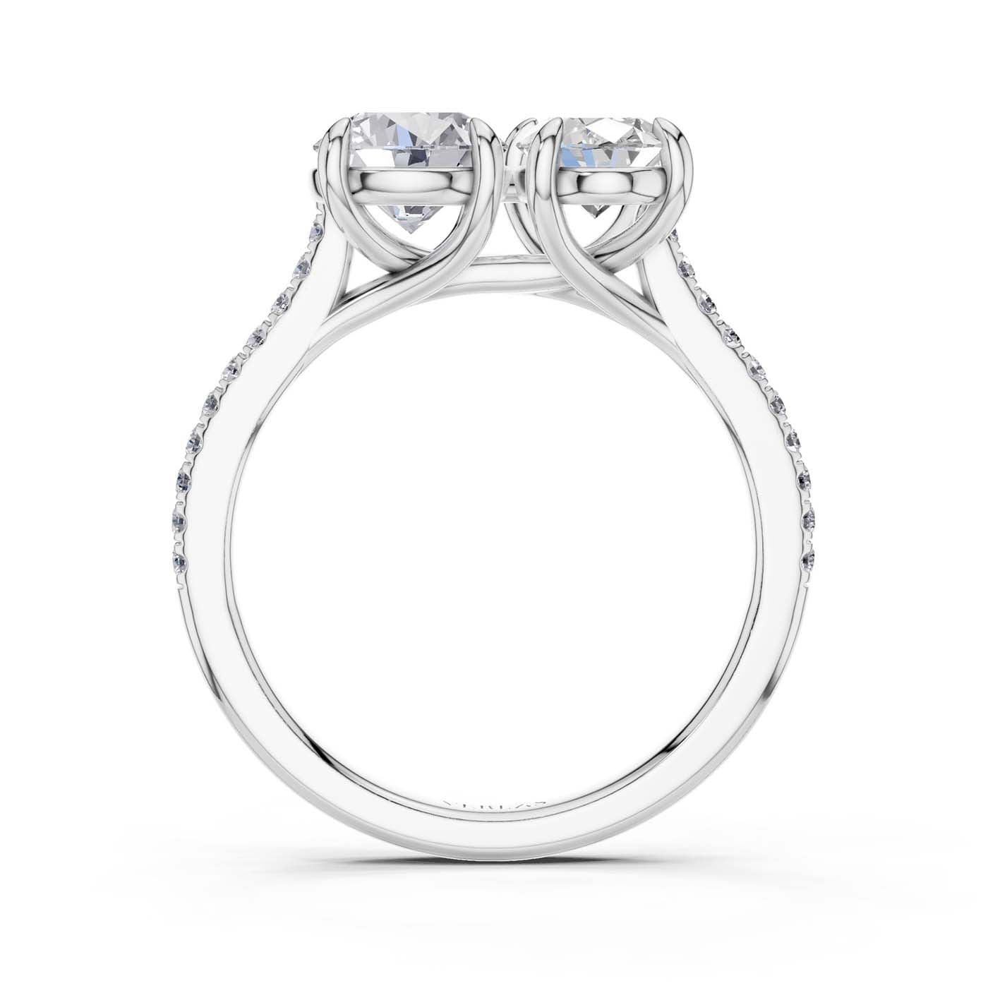 This captivating Toi et Moi consists of a duo of round and oval diamonds, each carefully seleCt.ed to represent the unique qualities that make your love story exceptional. Designed to ignite the sparks of passion and devotion, the ring's intricate shank, adorned with a trail of brilliant diamonds, mirrors the radiant journey of love.