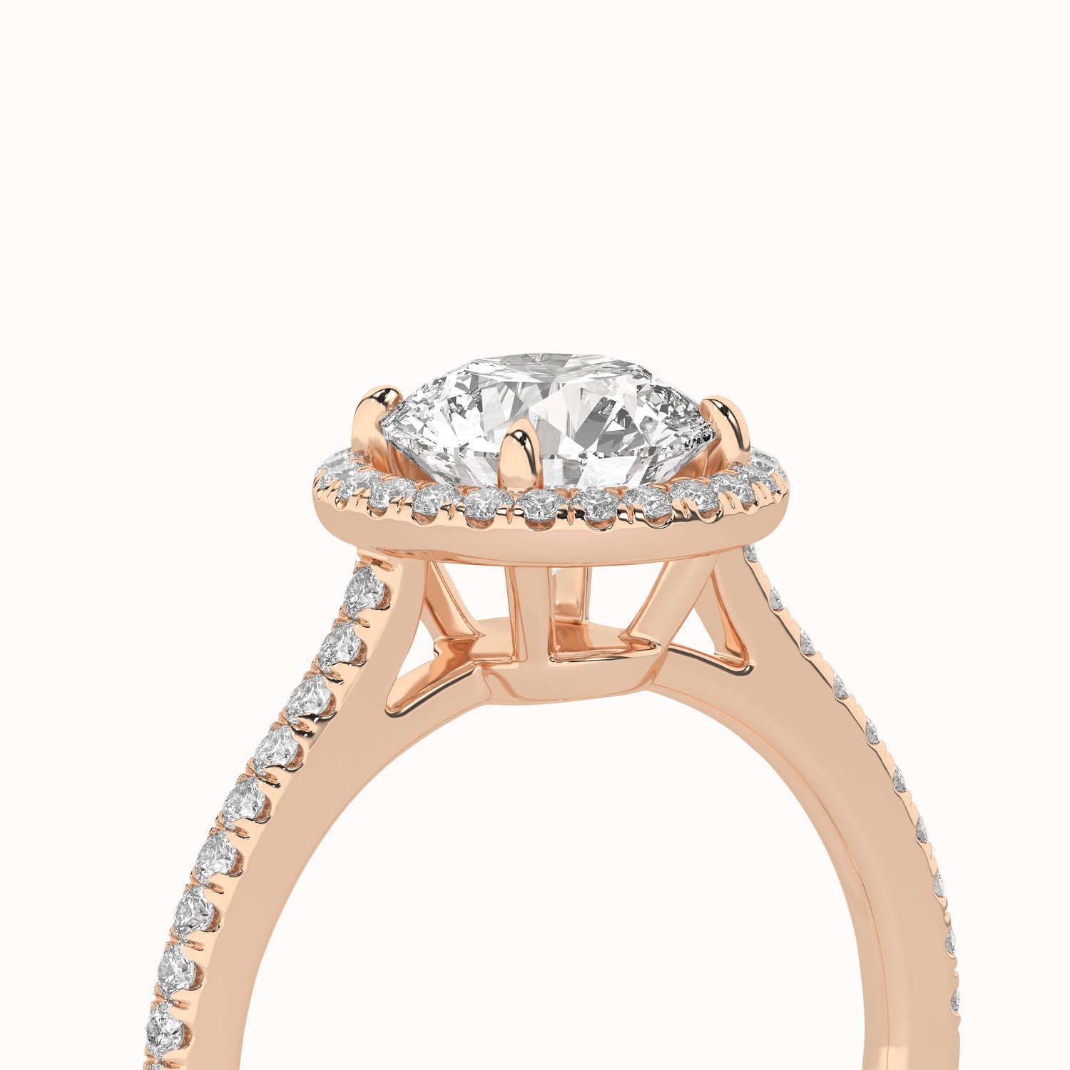 Featuring a single row of diamond pavé on the band creates a lift to focus on the round brilliant cut center diamond accentuating maximum brilliance. This round-shaped lab-grown diamond halo ring is striking, and the diamond row gives it a regal look and feel.