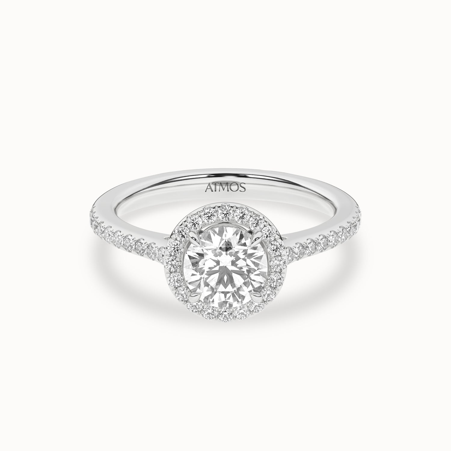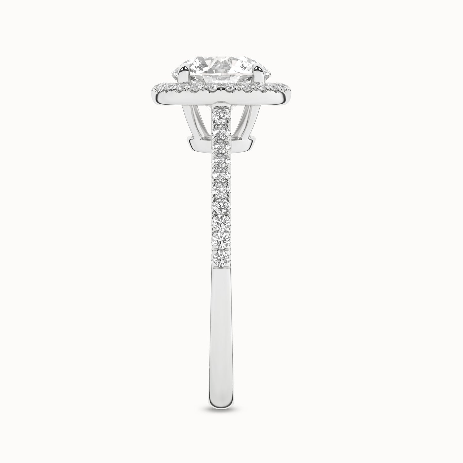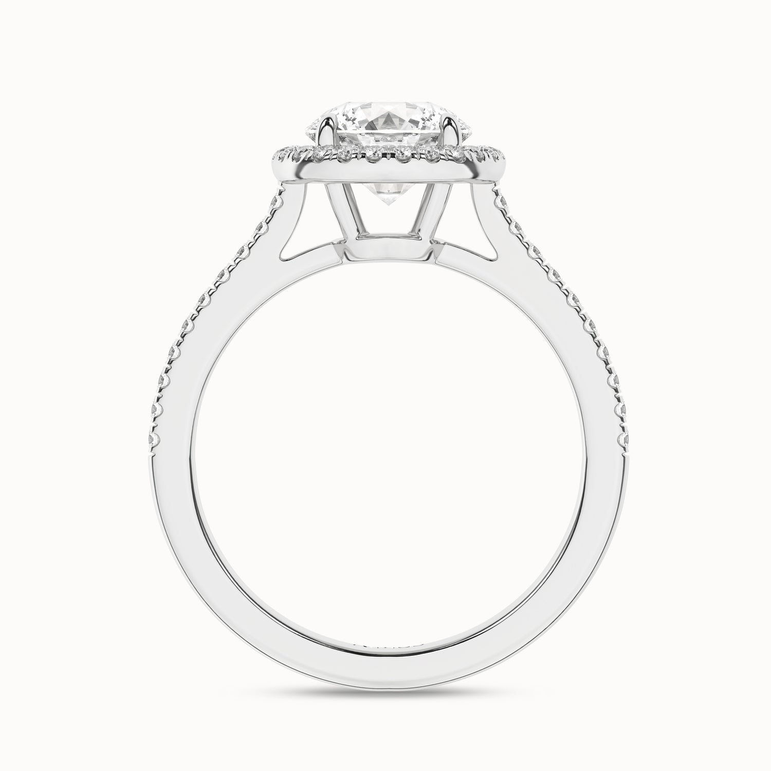 Featuring a single row of diamond pavé on the band creates a lift to focus on the round brilliant cut center diamond accentuating maximum brilliance. This round-shaped lab-grown diamond halo ring is striking, and the diamond row gives it a regal look and feel.