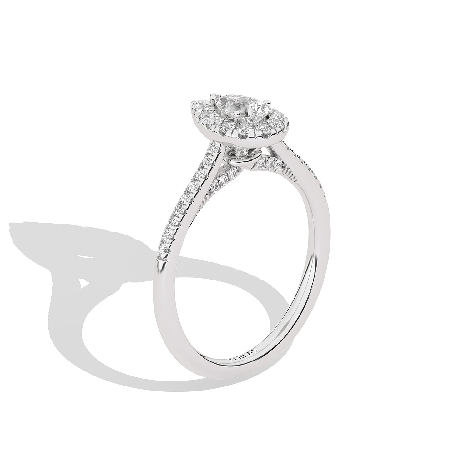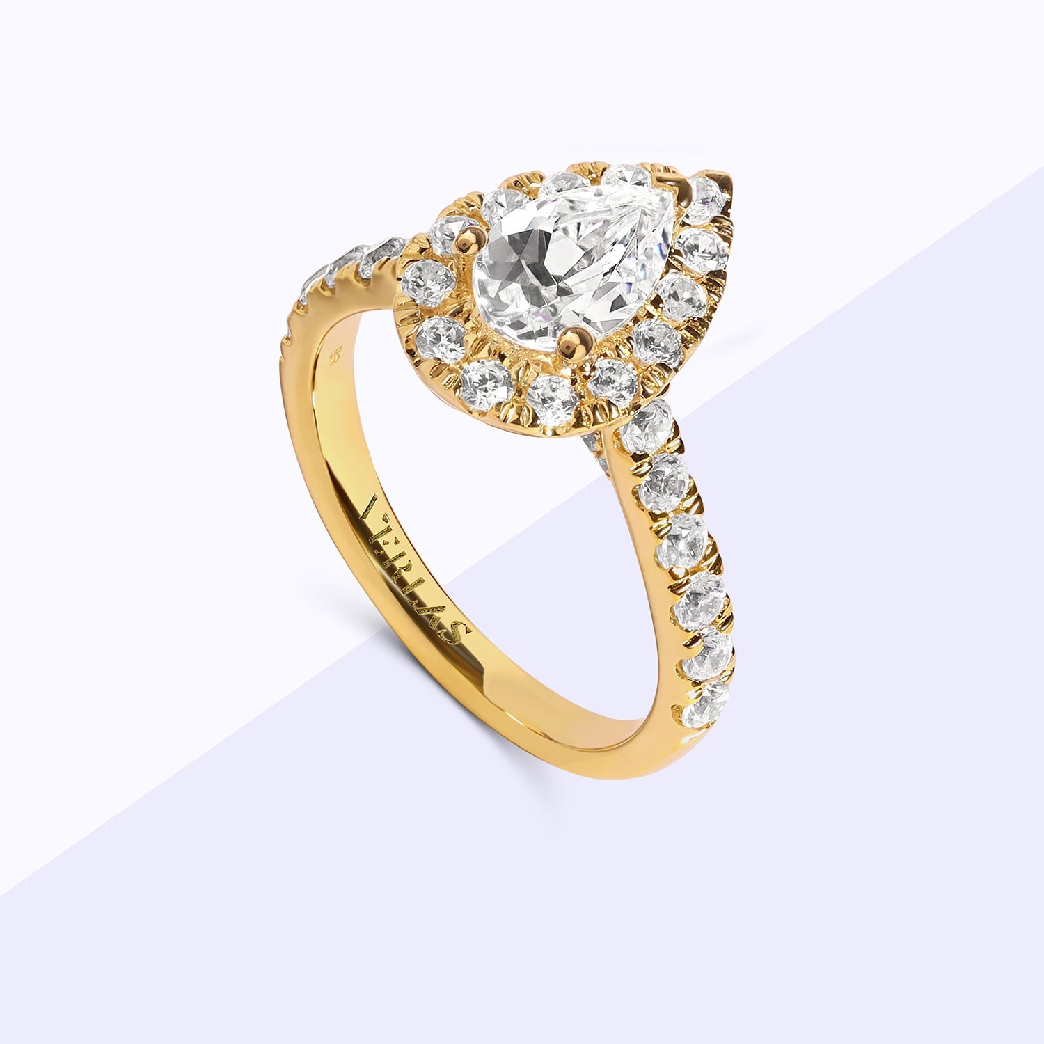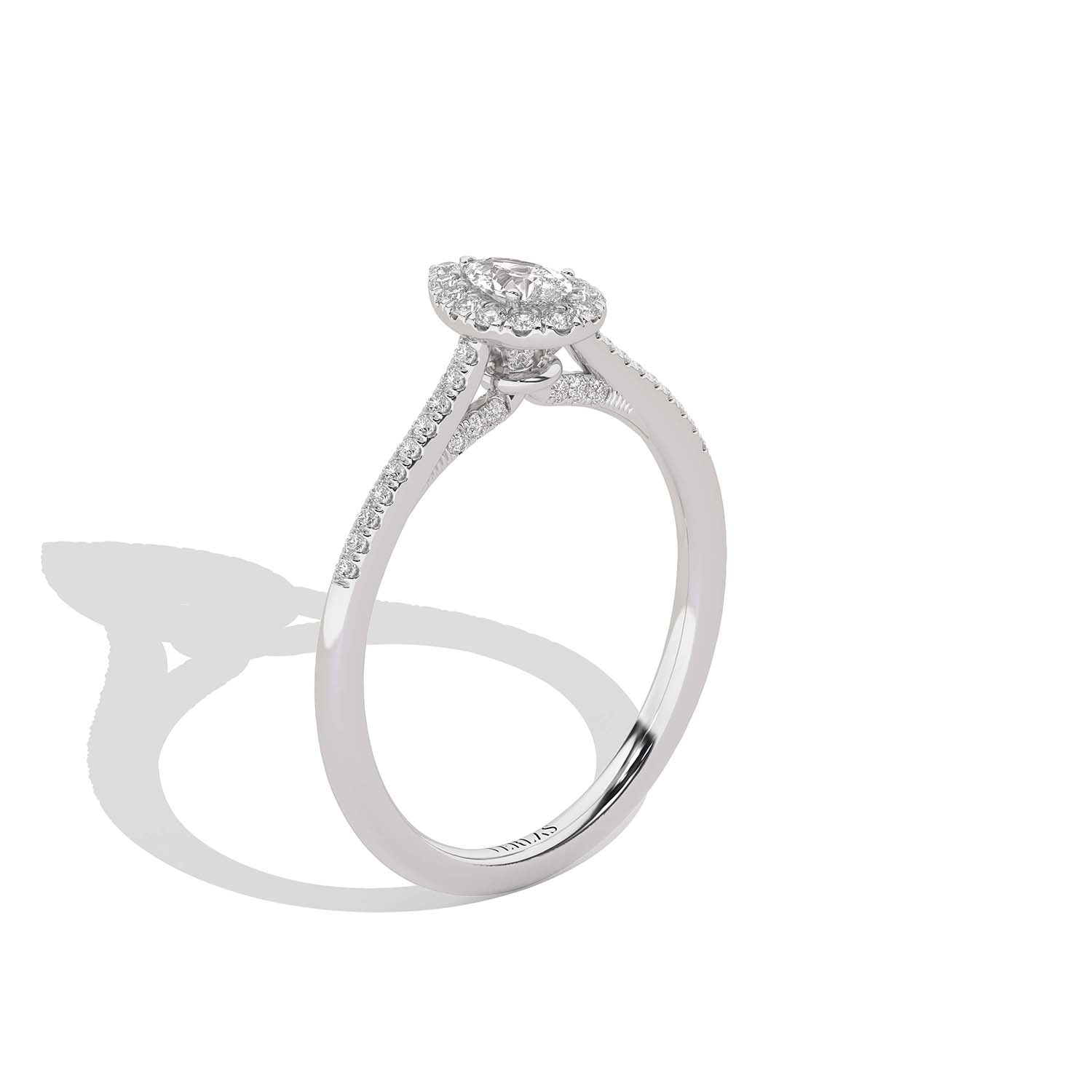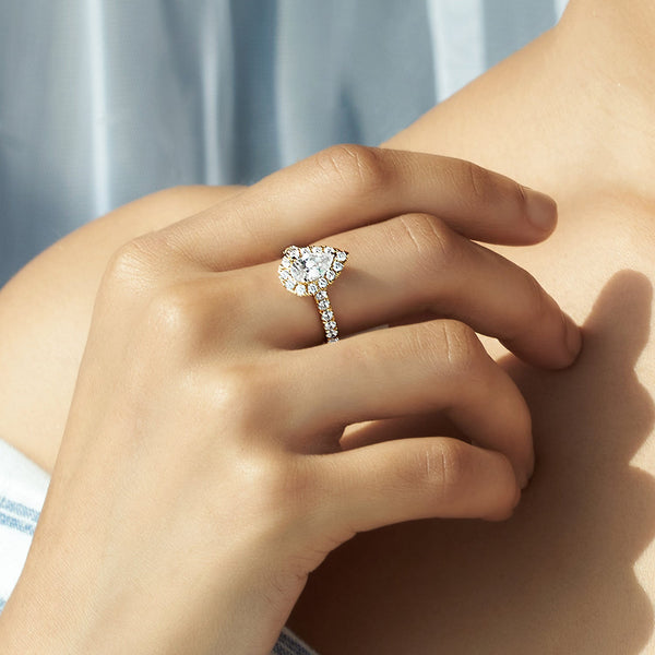 Steal the show with the Signature Dewdrop Halo Ring. This stunning ring features a sparkling dewdrop-shaped halo surrounding a dazzling pear-cut diamond centerpiece. With its intricate design and undeniable elegance, this ring is a true testament to your unique style.