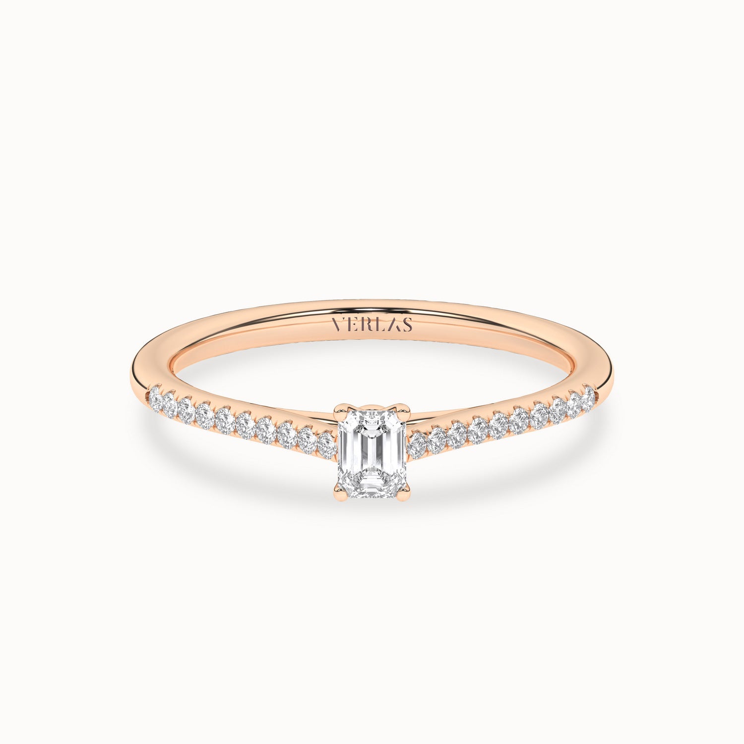 The Signature Emerald Ring is a luxurious and timeless piece. The emerald-cut diamond is set on a sleek gold band in a 4-prong setting. The band itself is studded with shimmering round diamonds. This exquisite ring exudes elegance and sophistication, making it a true statement piece.