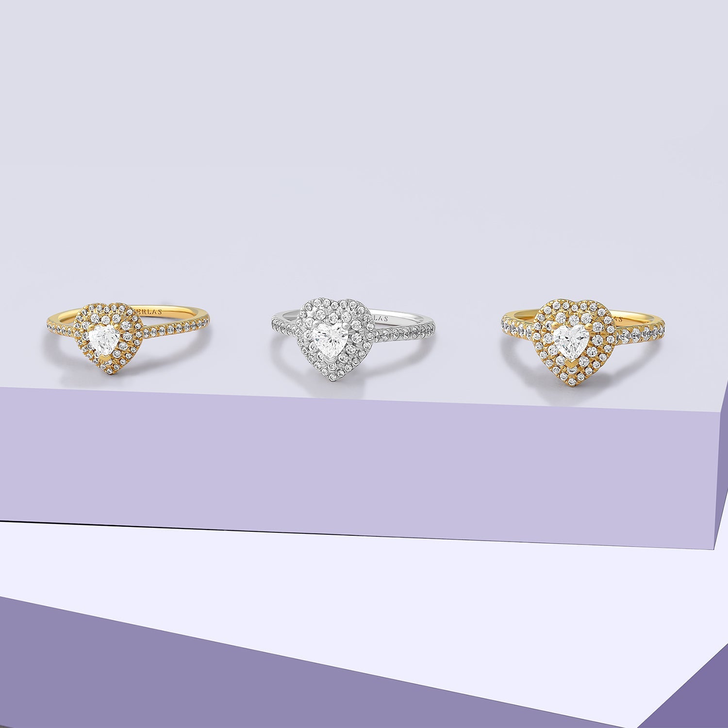 Crafted with precision, this Signature Heart Double Halo Diamond Engagement Ring is the embodiment of romance and commitment. The heart-cut diamond, renowned for its unique and romantic shape, takes center stage and is securely held in place by the dual halos, creating a mesmerizing display of light.