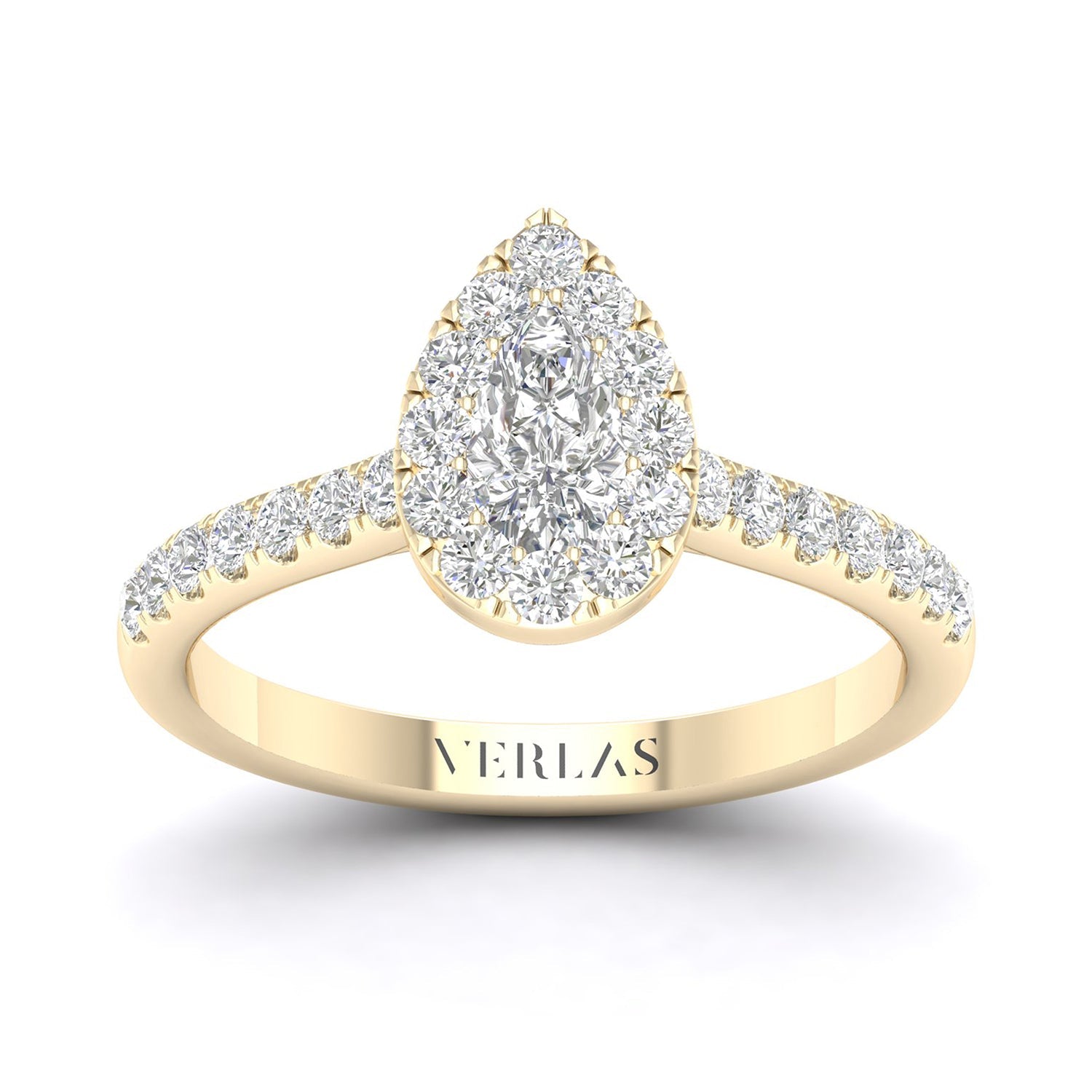 This ravishing Signature Iconic Dewdrop Halo Ring of a pear-shaped diamond illusion centered by petite round diamonds is endearing. With a strikingly brilliant and entirely graceful design, this pear-shaped diamond engagement ring is a beautiful choice to mark your life'. . . Read More