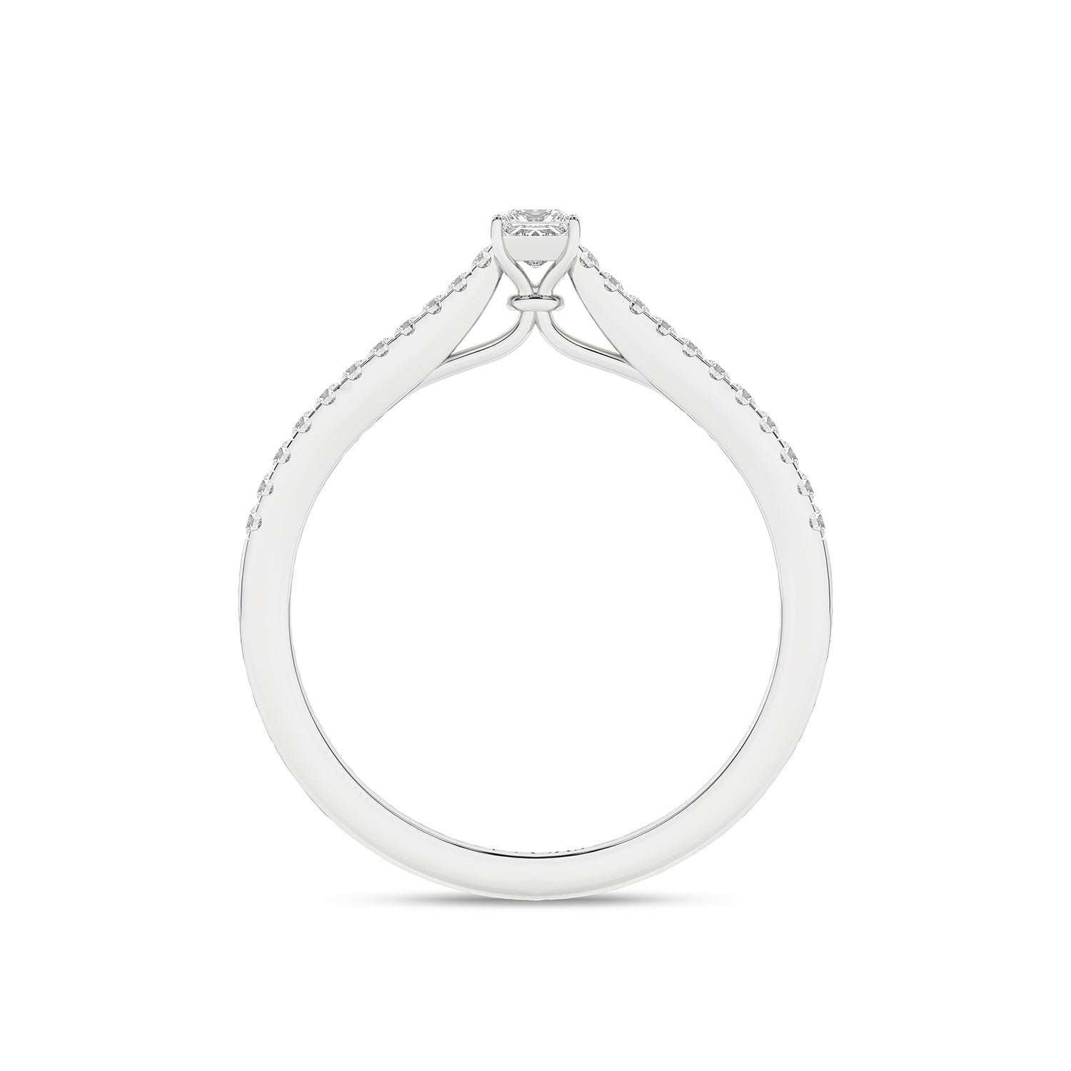 The Signature Princess Ring exceptionally showcases a princess-cut diamond's beauty and brilliance. The primary diamond is set in a four-prong setting that allows maximum light to enter and reflect, creating a dazzling sparkle. The band is sleek, smooth, and studded with. . . Show More