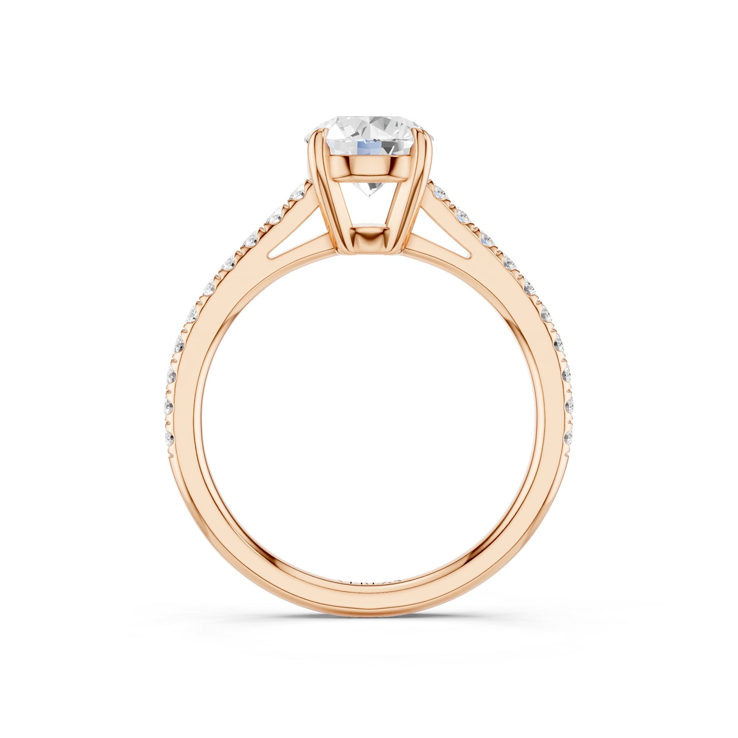 A scintillating halo of brilliant diamonds and a striking round center stone result in an unrivaled display of brilliance. The lab-grown engagement ring consists of a petite band with diamonds extending halfway down the shank.