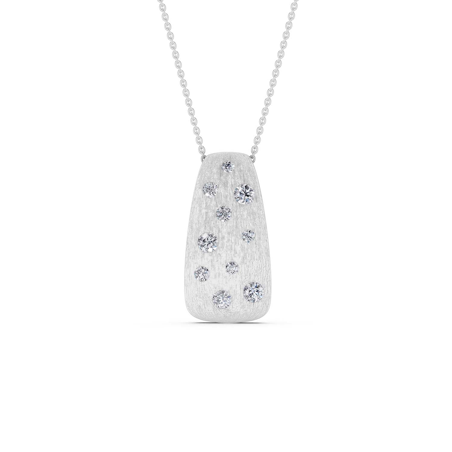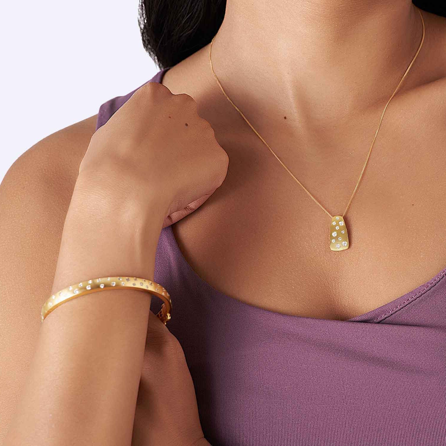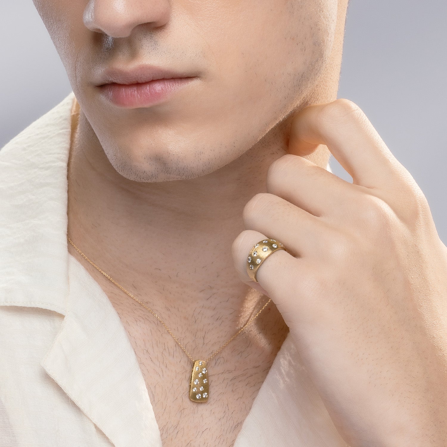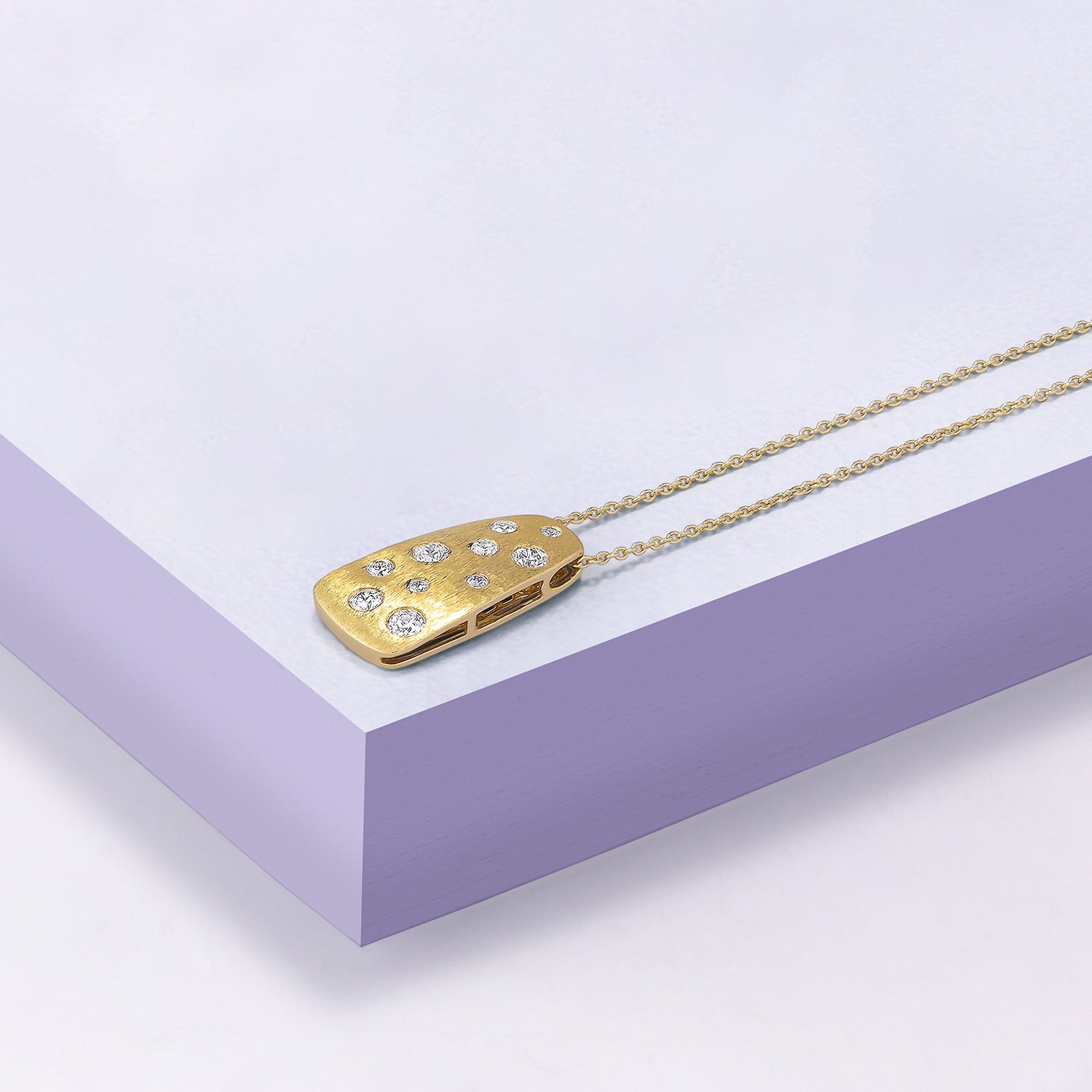 This Starlit Sky Necklace consists of sparkling diamonds dispersed on a satin-finished gold plate accentuating brilliance from every angle. True to its name, this diamond necklace pendant represents every twinkling star and is sure to bring radiance to any outfit.