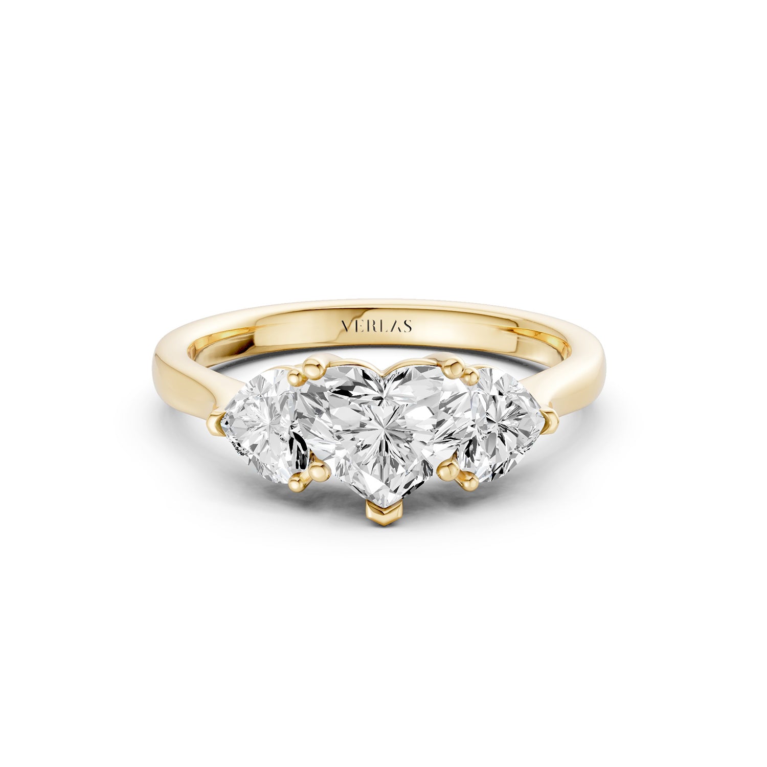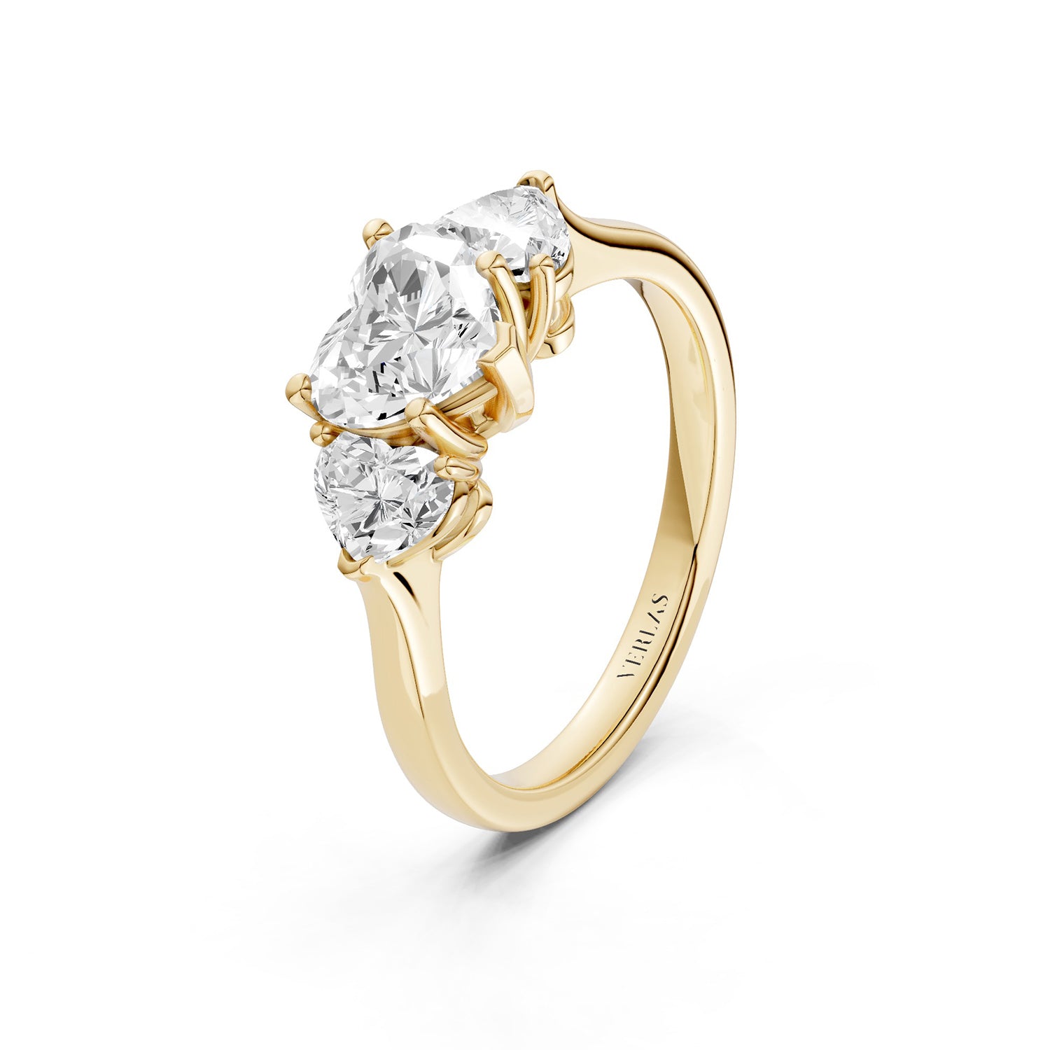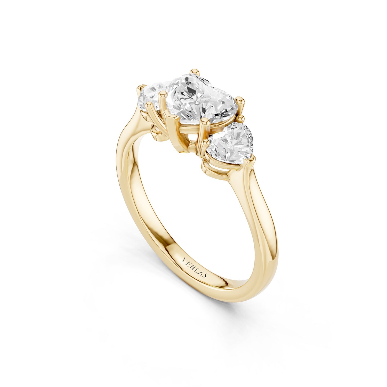 The Trinity Heart Ring is a beautiful representation of love's journey. This elegant gold ring features a trio of sparkling heart-shaped lab-grown diamonds. A single larger heart-shaped diamond takes center stage, symbolizing the strength and depth of love. It is gracefully flanked by two smaller heart-shaped diamonds, representing the companionship and support that nurture a loving relationship.