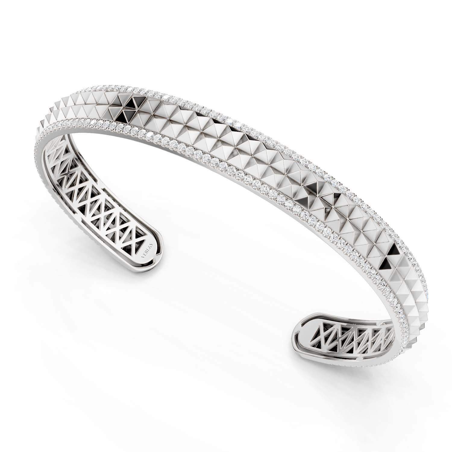 Experience modern elegance with our Two-Tier Pyramid Diamond Cuff Bracelet, a stunning fusion of bold geometry and luxurious sparkle. At the heart of this masterpiece is a striking double row of pyramid motifs that wrap continuously around the bracelet, creating a captivating architectural design. Adjoining the center pyramids on both sides are two rows of dazzling lab-grown diamonds. The combination of sharp pyramid contours and the seamless diamond rows creates a striking balance between edgy and refined. This diamond bracelet is perfect for elevating a formal ensemble or adding a bold statement to your everyday look.