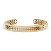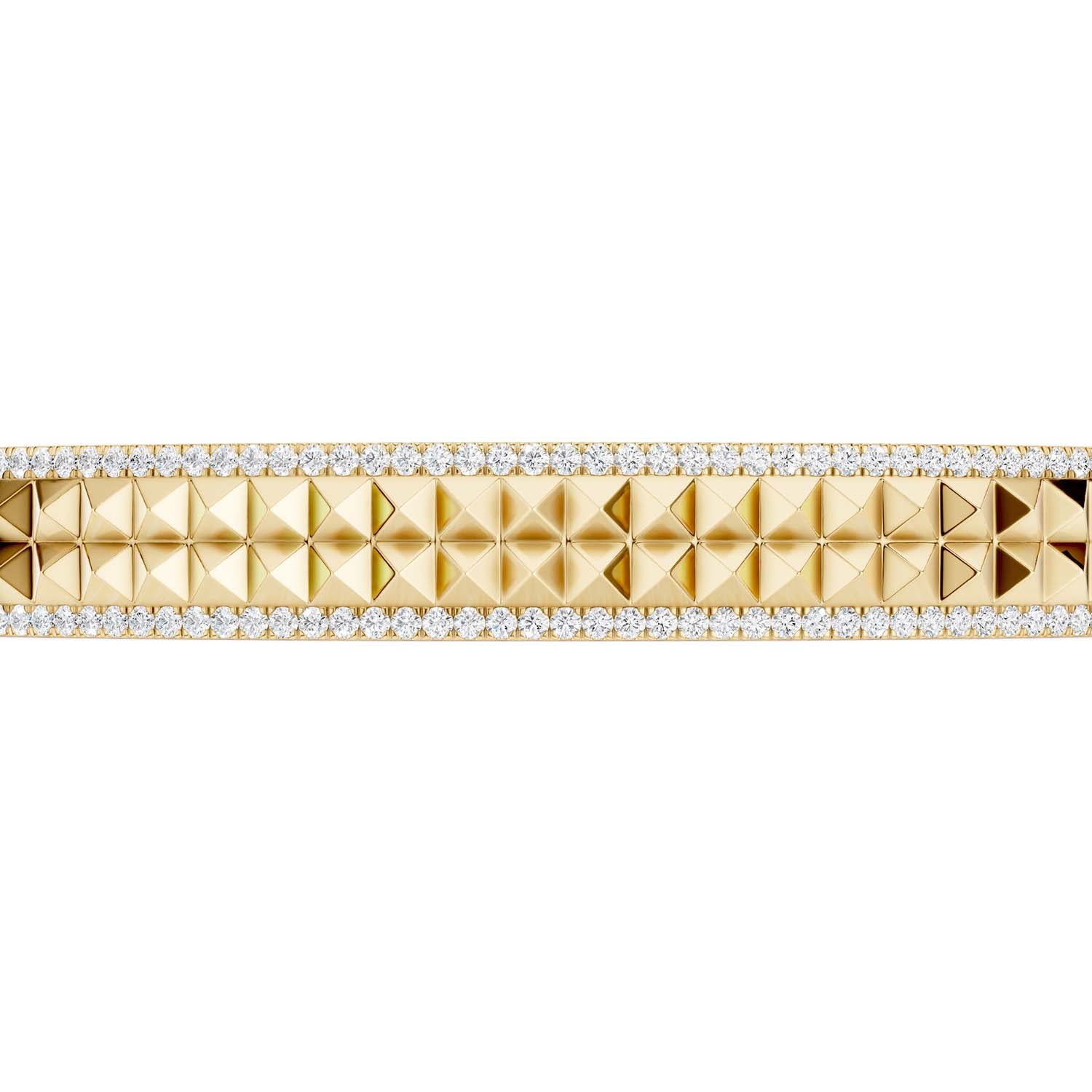 Experience modern elegance with our Two-Tier Pyramid Diamond Cuff Bracelet, a stunning fusion of bold geometry and luxurious sparkle. At the heart of this masterpiece is a striking double row of pyramid motifs that wrap continuously around the bracelet, creating a captivating architectural design. Adjoining the center pyramids on both sides are two rows of dazzling lab-grown diamonds. The combination of sharp pyramid contours and the seamless diamond rows creates a striking balance between edgy and refined. This diamond bracelet is perfect for elevating a formal ensemble or adding a bold statement to your everyday look.