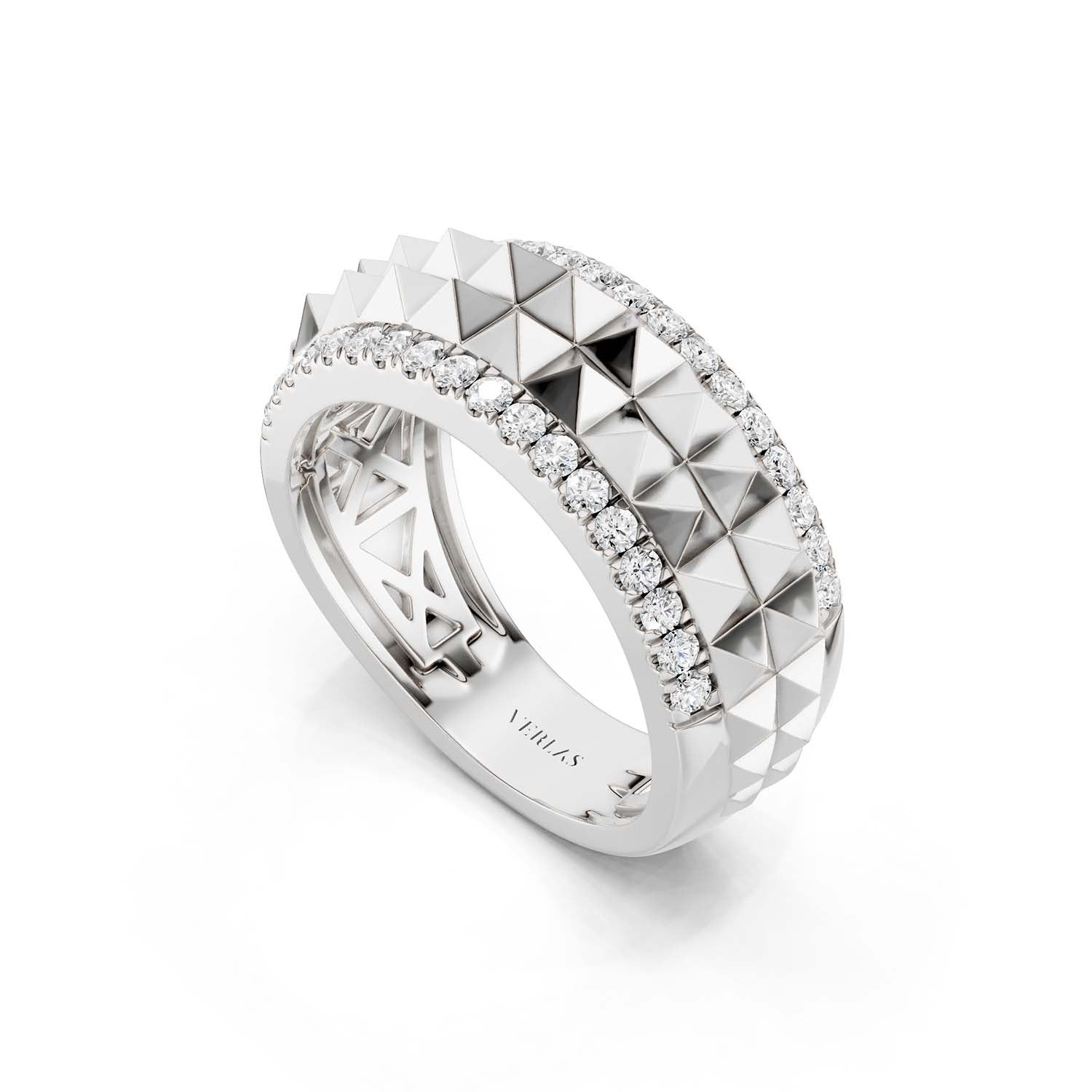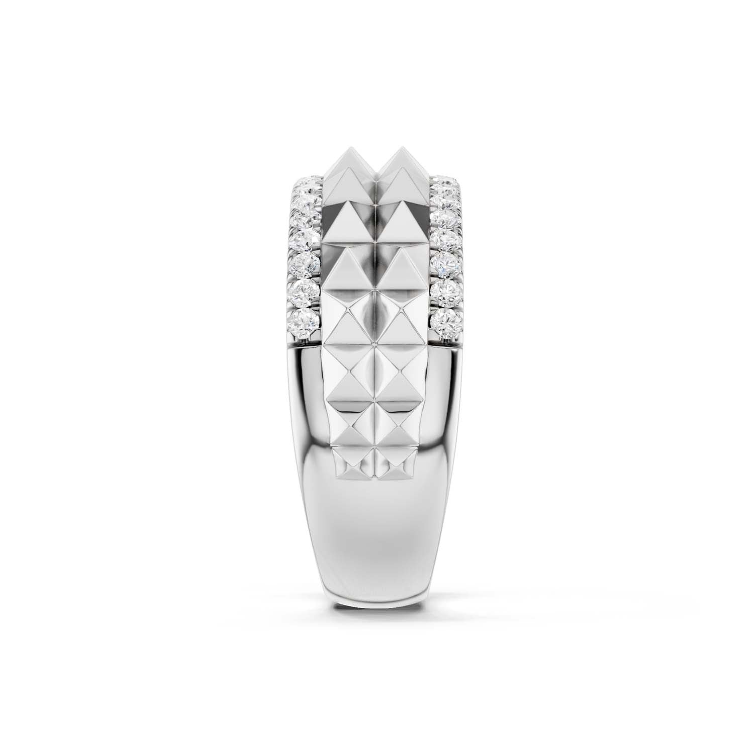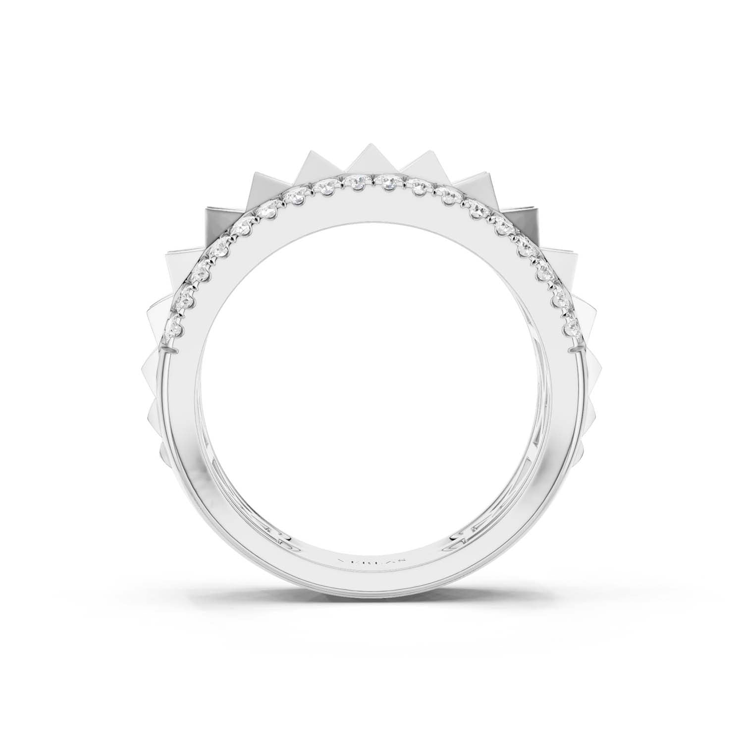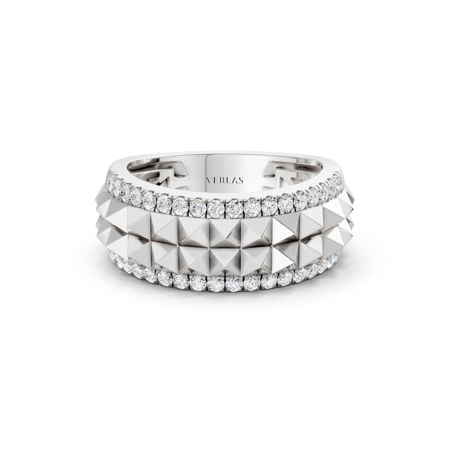 Redefine elegance with the Two-Tier Pyramid Diamond Band, a stunning fusion of geometric precision and luxurious sparkle. At the heart of this captivating design are two rows of sleek pyramid motifs that wrap around the entire band, creating a unique and striking visual effect. Flanking on either side, two rows of brilliant lab-grown diamonds shimmer endlessly, adding layers of brilliance that catch the light from every angle. Whether worn alone for a sophisticated statement or stacked with other rings for a layered look, this diamond band effortlessly transitions from day to night.
