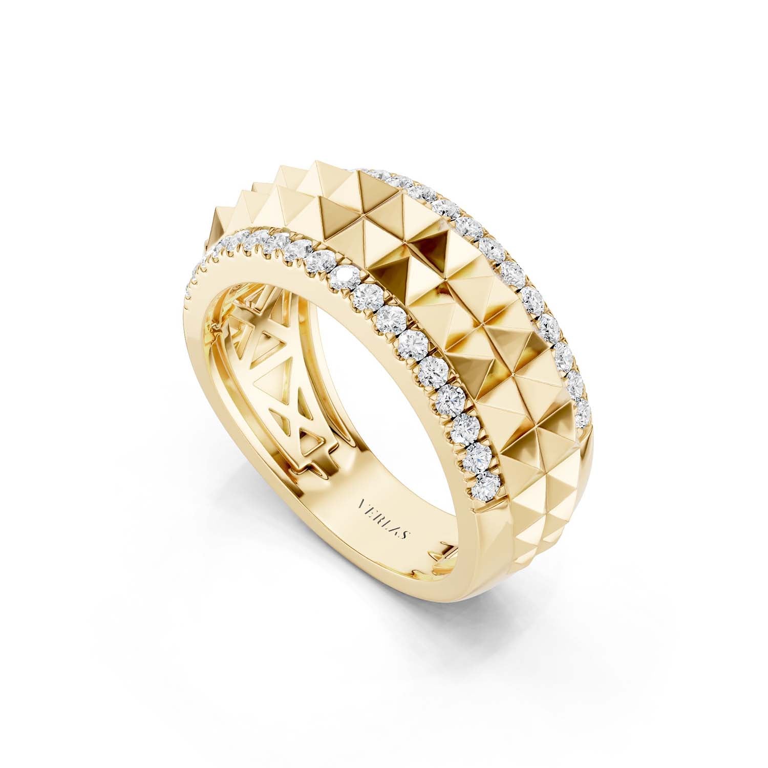 Redefine elegance with the Two-Tier Pyramid Diamond Band, a stunning fusion of geometric precision and luxurious sparkle. At the heart of this captivating design are two rows of sleek pyramid motifs that wrap around the entire band, creating a unique and striking visual effect. Flanking on either side, two rows of brilliant lab-grown diamonds shimmer endlessly, adding layers of brilliance that catch the light from every angle. Whether worn alone for a sophisticated statement or stacked with other rings for a layered look, this diamond band effortlessly transitions from day to night.
