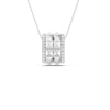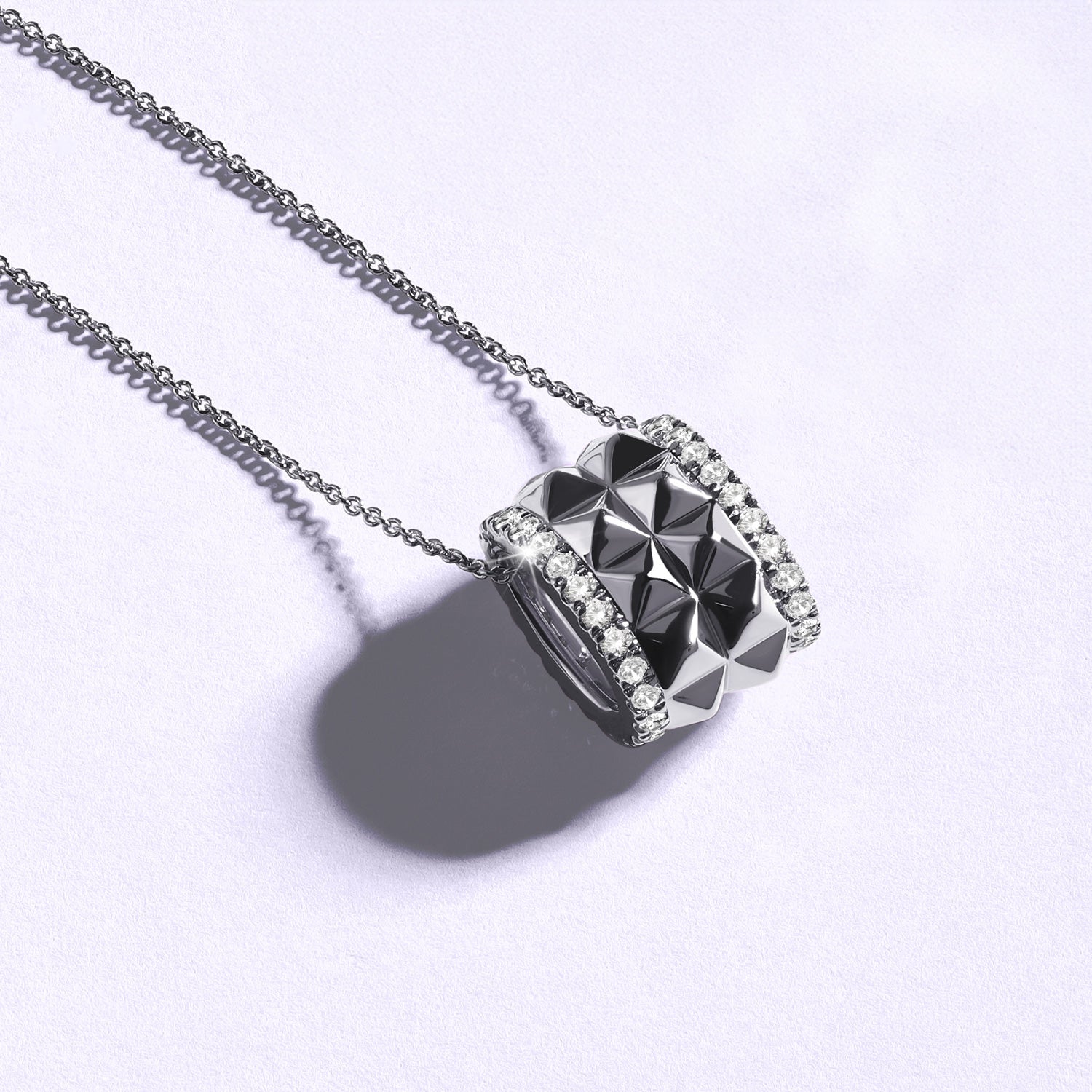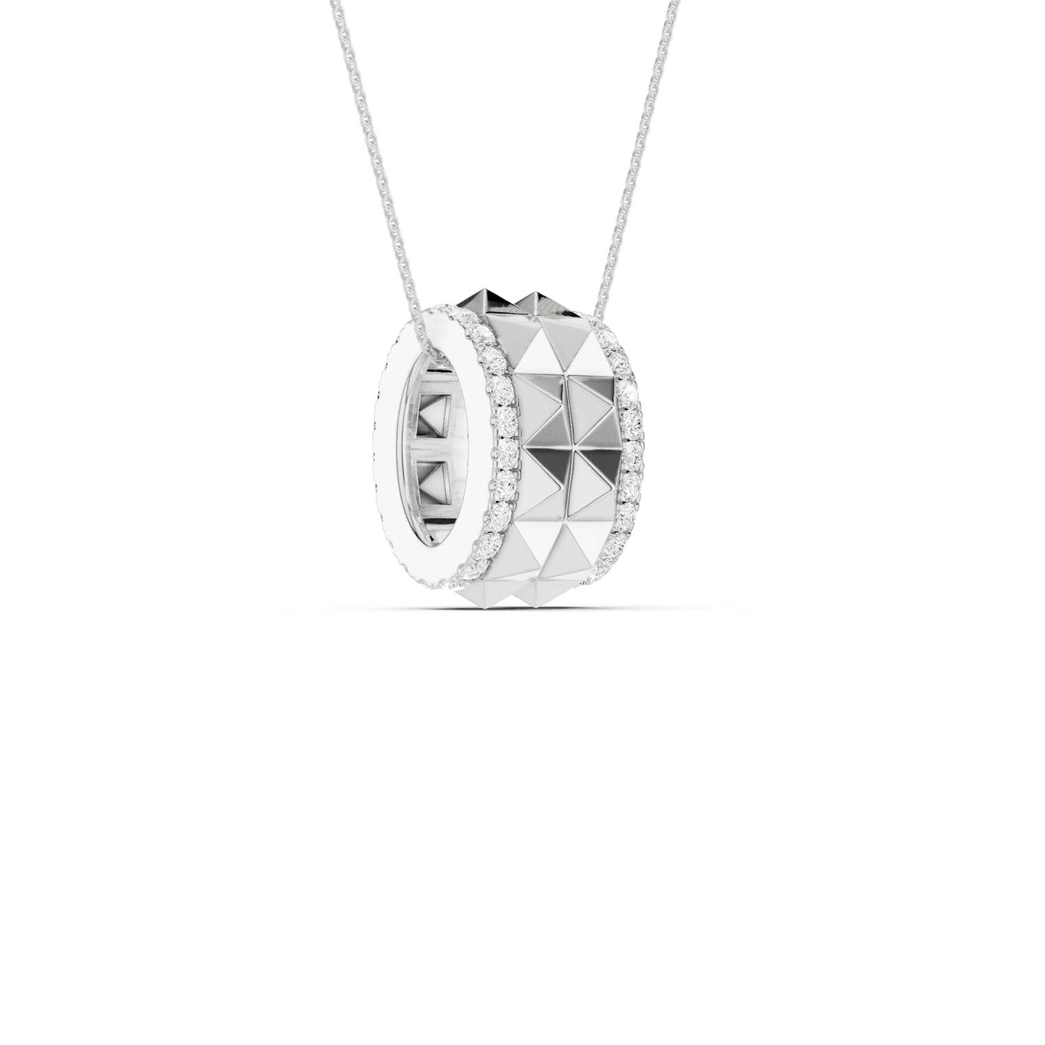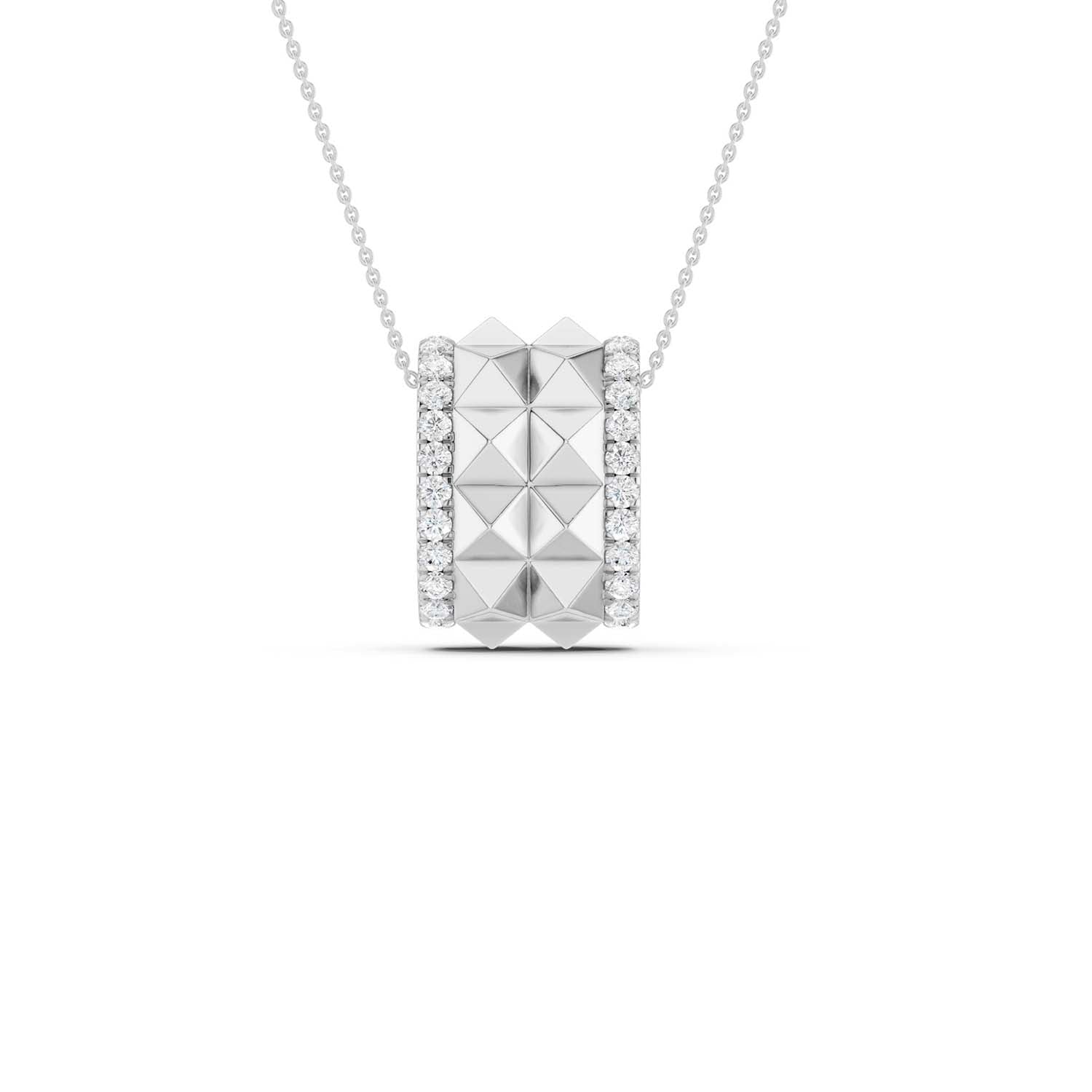 Discover a bold expression of style with our Two-Tier Pyramid Spiked Pendant Necklace, a stunning piece that combines geometric elegance with intricate craftsmanship. This eye-catching diamond pendant necklace features two rows of textured pyramid shapes forming a striking band around the pendant, creating a dynamic visual effect that captivates from every angle. Surrounding the central design is a delicate border adorned with round lab-grown diamonds that catch the light beautifully. Perfect for elevating your everyday look or adding a statement touch to special occasions, this geometric pendant necklace embodies modern elegance and artistic flair.